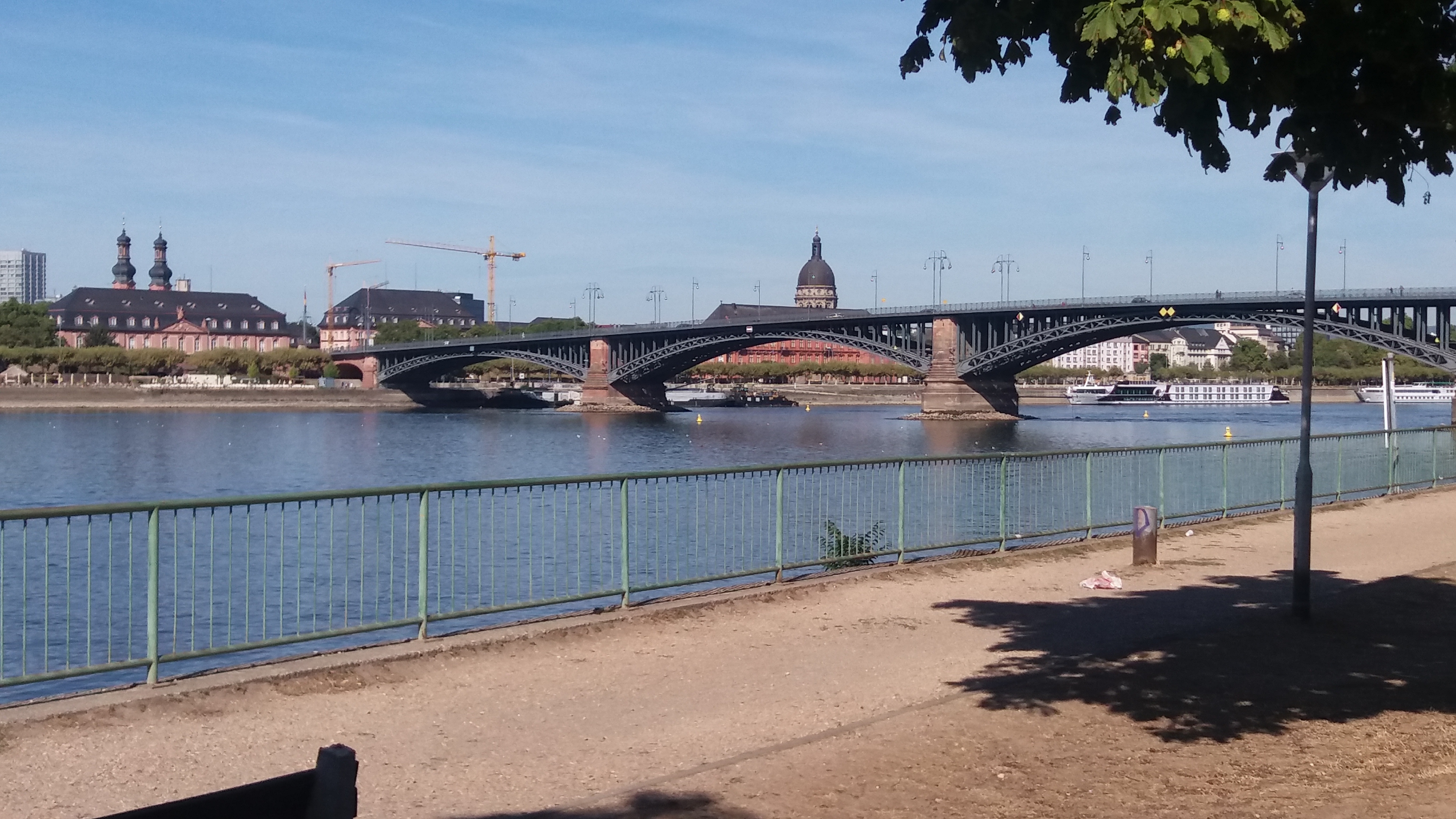 Die Theodor-Huess-Brücke im Vordergrund und im rechten Hintergrund die evangelische Christuskirche in Mainz.