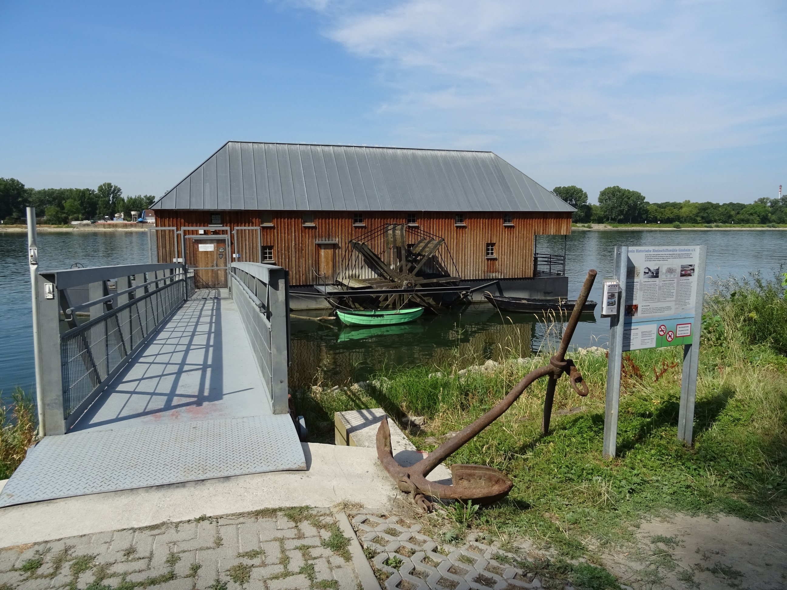 Über mehrere Jahrhunderte hinweg arbeiteten Schiffsmühlen im Rheinstrom vor Ginsheim. Bis zu 21 dieser schwimmenden Kleinbetriebe zur Getreideverarbeitung waren hier gleichzeitig verankert. Entstehung und Zweck der Schiffsmühlen kann man der Informationstafel entnehmen. Die Funktionsweise wird im folgenden Film beschrieben.